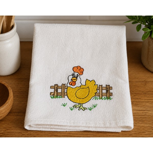 Cute farmhouse chicken embroidery design featuring a rustic hen and fence, perfect for kitchen towels and country-style decor. Fits 5x7 hoop and adds a warm, charming touch to your embroidery projects.
